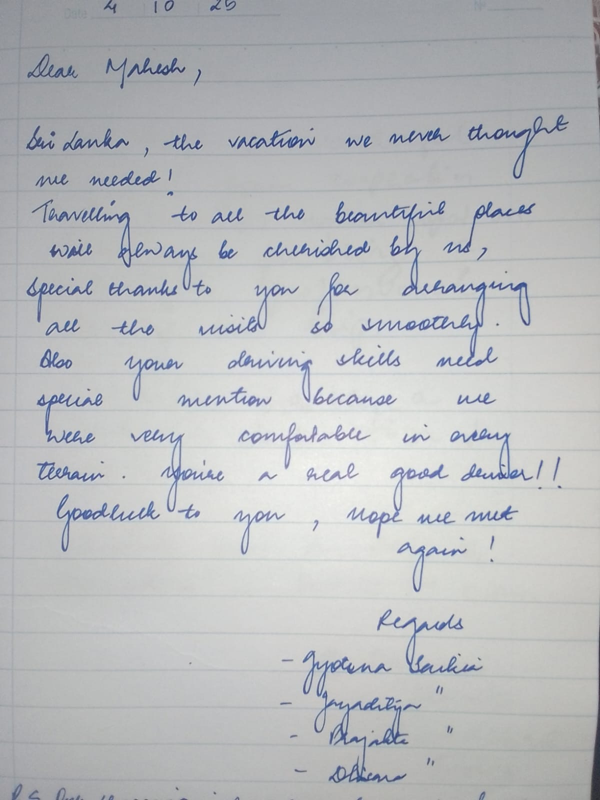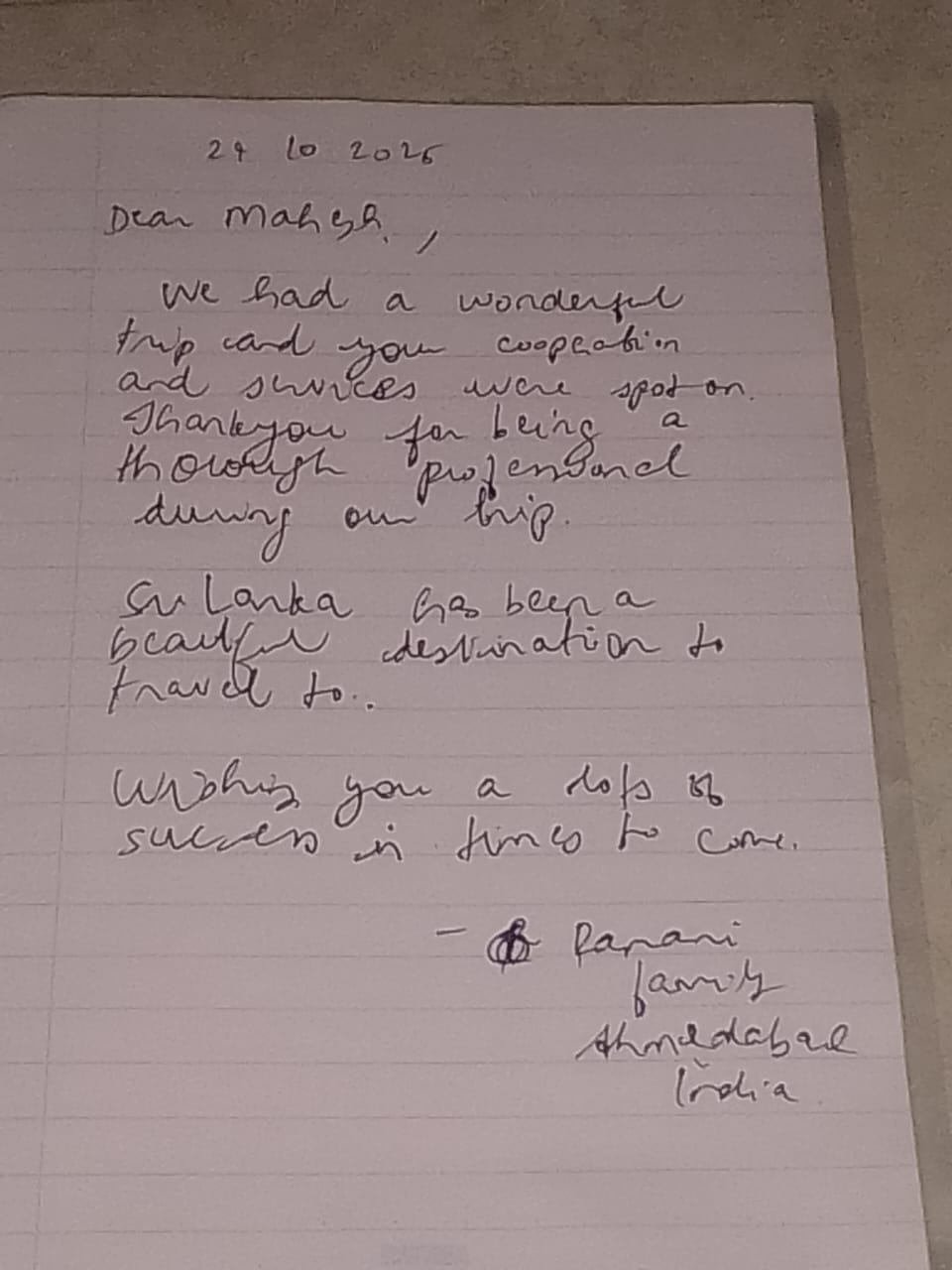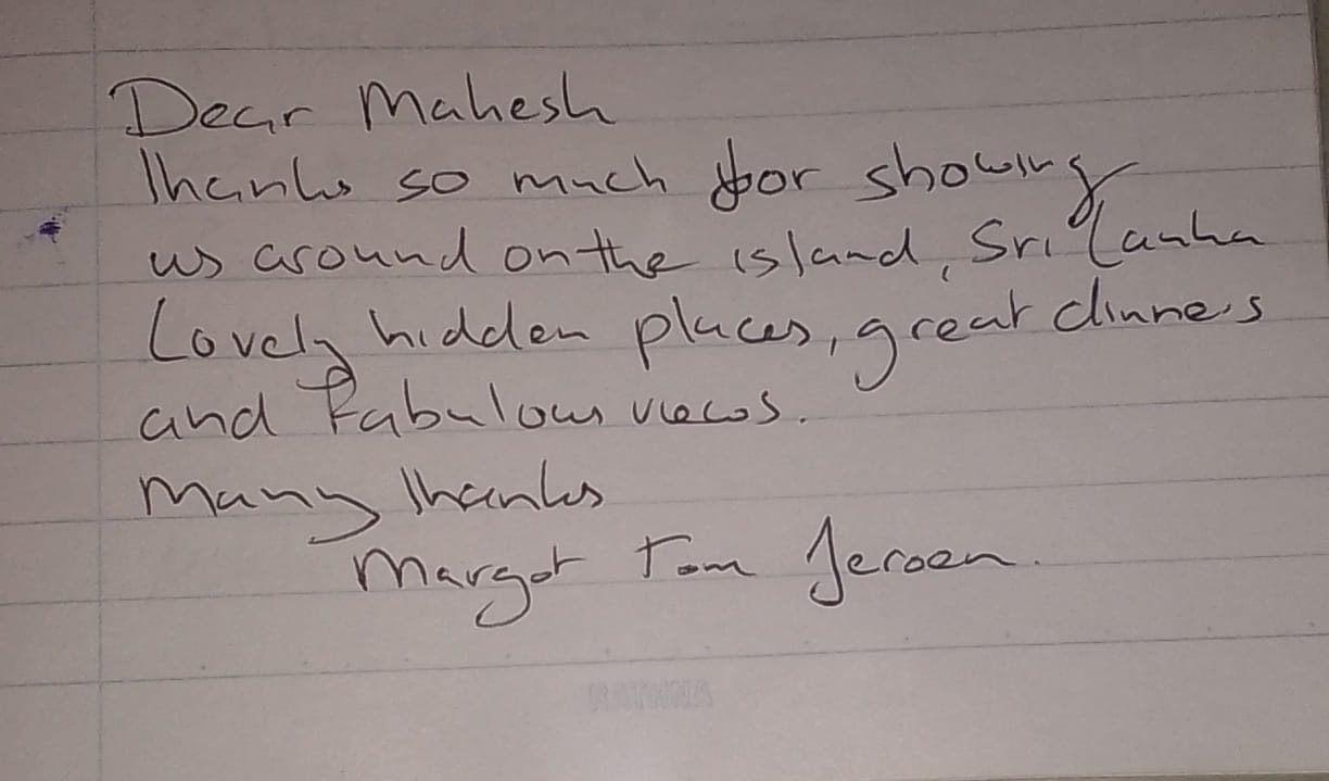Thanks so much for showing us around on the island, Sri Lanka Lovely hidden places, great dinnes and Fabulous viacos.